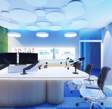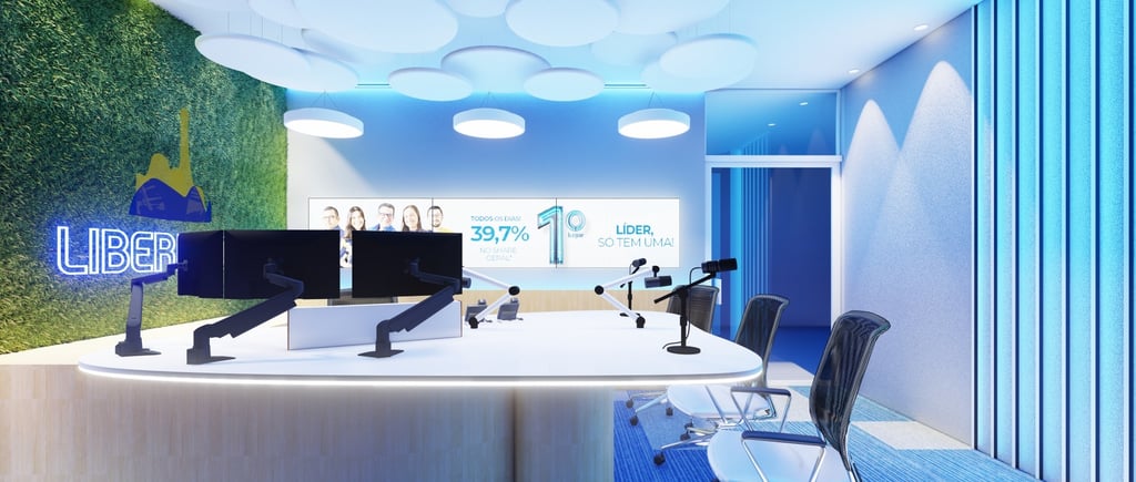 A estética do estúdio reforça essa nova fase. A paleta em tons de azul transmite credibilidade, tecnologia e serenidade, enquanto o uso da madeira aquece o ambiente e cria uma conexão com a história e a proximidade que sempre marcaram a Rádio Liberdade. O painel vegetal com o logotipo iluminado atua como elemento icônico do projeto, fortalecendo a marca no enquadramento das transmissões e trazendo um contraste natural ao espaço altamente tecnológico.