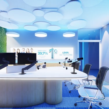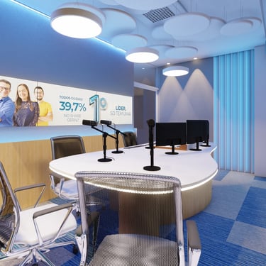 O projeto foi concebido a partir do equilíbrio entre tradição e inovação. O layout orgânico da bancada central favorece a dinâmica entre locutores, convidados e operadores, ao mesmo tempo em que garante enquadramentos limpos e bem resolvidos para as câmeras. Cada posição foi pensada para funcionar tanto para o rádio quanto para o vídeo, integrando microfones, monitores e equipamentos de forma precisa e visualmente leve.