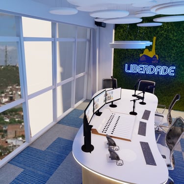 As grandes aberturas envidraçadas conectam o estúdio à paisagem urbana de Caruaru, reforçando a ideia de uma rádio contemporânea, aberta e conectada com a cidade e com seu público. Assim, o novo estúdio da Rádio Liberdade não é apenas um espaço de trabalho, mas um palco de comunicação multiplataforma, preparado para o presente e para o futuro, sem jamais perder a essência que a consagrou ao longo de décadas.